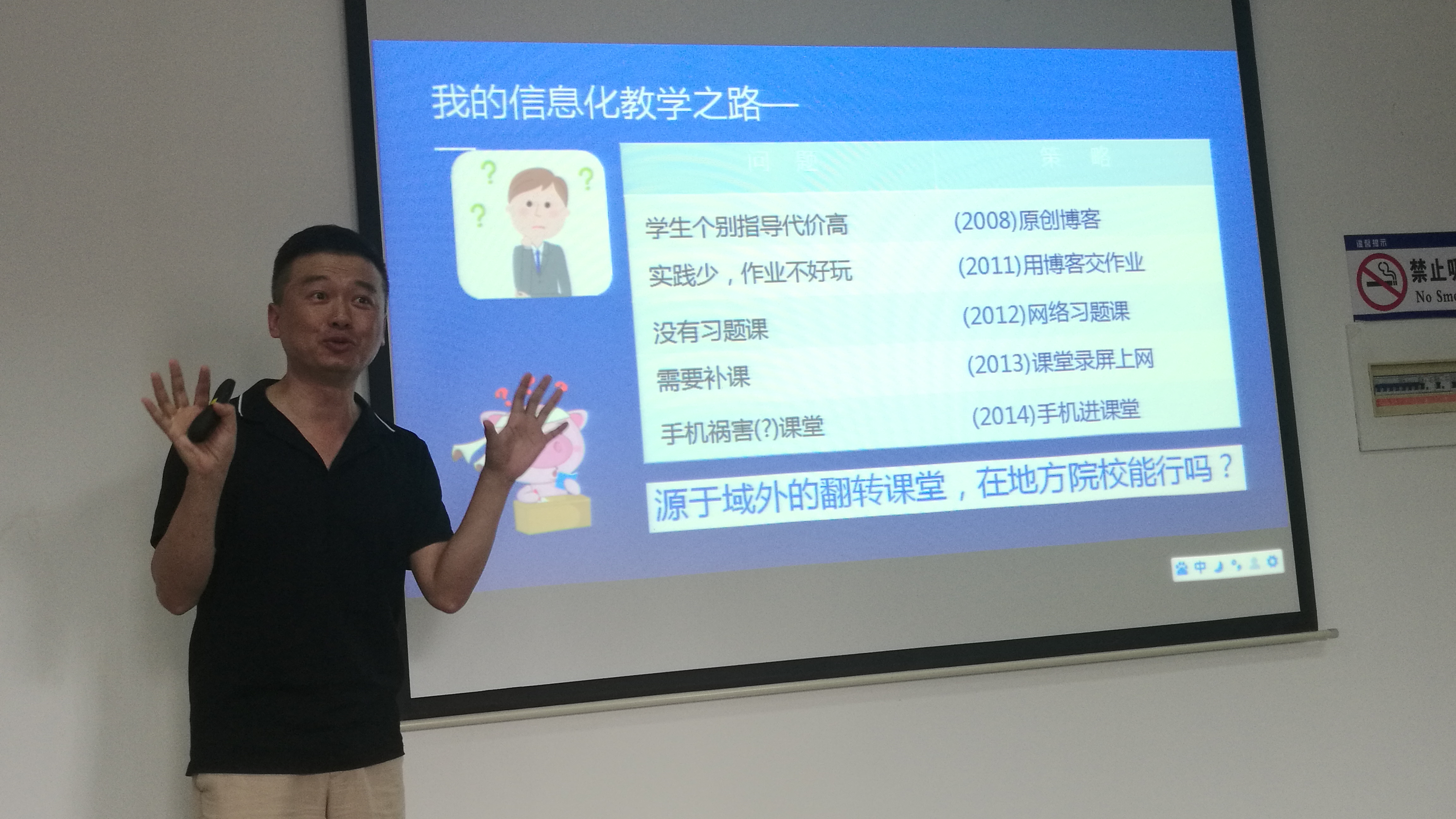 董晓东以《翻转课堂教学方法与体会》为题,在接受翻转课堂教学先锋烟台大学贺利坚教授教学分享基础上,进一步挖掘我院教师与学生教与学现状,从信息化教学必要性、认识翻转课堂、总体教学设计、课前教学设计、课堂教学设计、课程设计范例六个方面分解与阐述,试图解决教师与学生在教与学中的困惑,实现教师真正做到会教,学生做到真正会学。