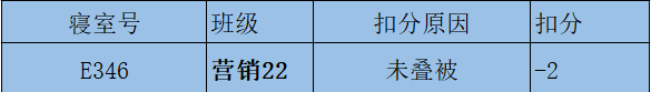 每周中午12:30,工商管理学院对全体本科生宿舍进行检查。在检查过程中发现大多数宿舍能够保持整体干净整洁,不乱扔垃圾,桌面摆放整齐,对这些优秀宿舍给予表扬。也有一些寝室内务卫生方面有待加强。现将检查结果公示如下: