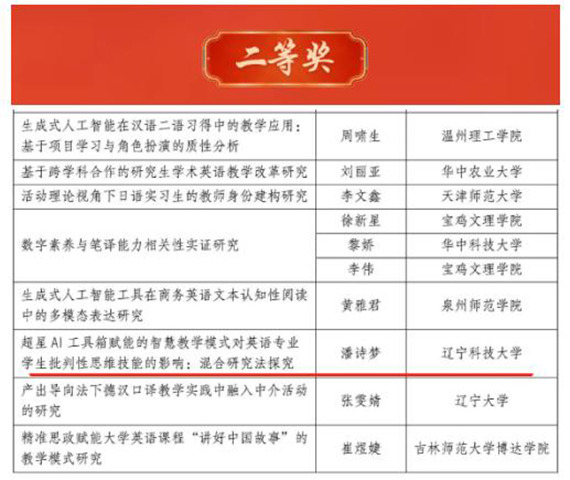 外语学院负责同志介绍,近年来,学院始终重视教研融合,通过搭建学术交流平台、支持课题研究等方式,鼓励教师立足教学实践开展学术探索。此次获奖是学院推动“教学科研一体化”建设的重要成果,将进一步激励全院教师深耕教研领域,为培养兼具国际视野与本土情怀的高素质外语人才、助力学校教育教学高质量发展注入新动力。 (供稿单位:外语学院 图片来源:外语学院)